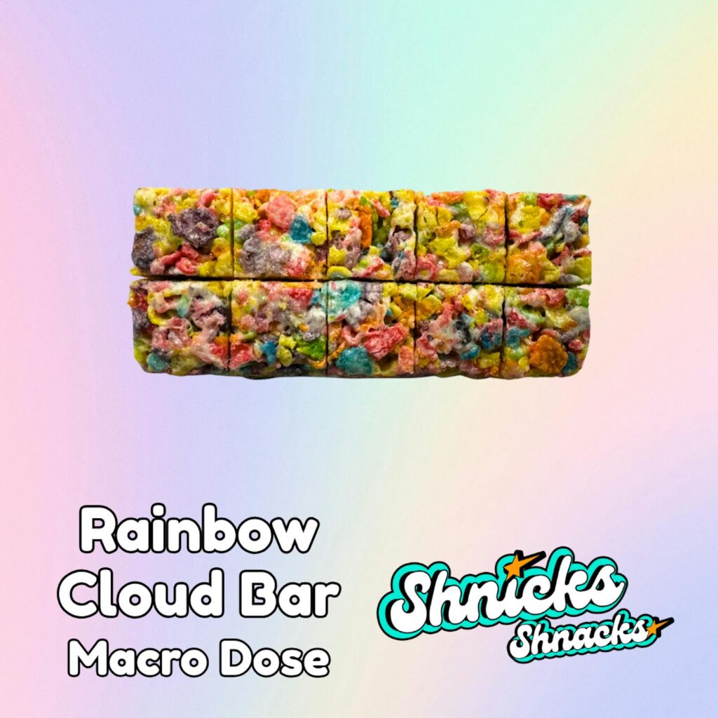 For something a little more nostalgic, meet Shnicks Shnacks. Their cereal bar edibles take a familiar childhood treat and give it an adult twist. The Rainbow Cloud Bar mixes fruity cereal with melted marshmallow for a colorful crunch, while the Cocoa Cloud Bar Macro Dose leans fully into rich chocolate cereal and marshmallow for anyone who prefers something on the sweeter side. Each Shnicks Shnacks bar is hand-crafted and delivers that classic cereal-treat texture with a consistent infused experience.